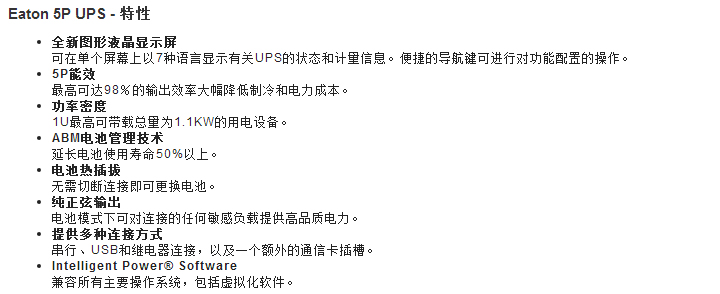 為滿足全球客戶對UPS日益提升的安全、可靠、有效率及穩定性的需求, EATON集團秉承為客戶提供專業整體解決方案的理念,結合當前智能化和綠色環保的發展趨勢,推出新一代在線互動式UPS 5P系列650~1550VA,為IT和企業辦公設備及網絡機房提供更智能、更環保的電力保護方案。